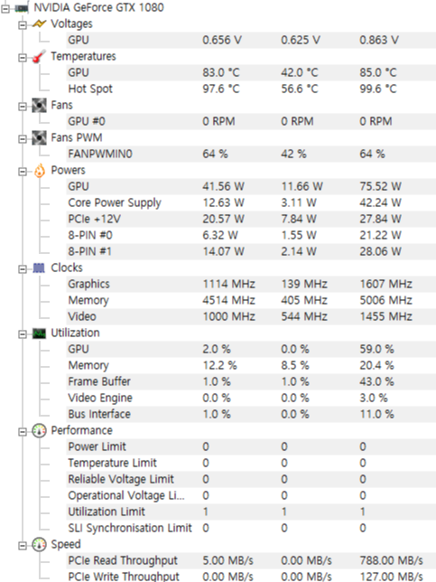 그래픽카드 최고온도는 85도, 핫스팟은 99.6도